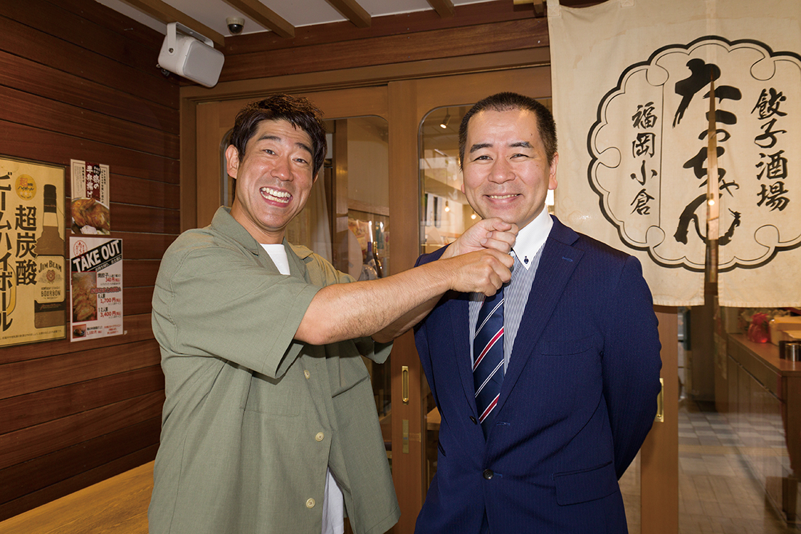 西早稲田駅 徒歩3分、福岡県北九州市発祥で餃子が人気の「餃子酒場たっちゃん 西早稲田店」にて。アツアツの焼き餃子と肉汁餃子に舌鼓を打ちながら、対談がスタート!