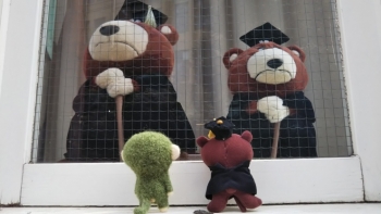 この辺りには朝鮮由来の石像が数多く置かれているのが特徴で、2号館入り口に左右に置かれている石羊はフォトスポットにもなります。ワセダベアは…角帽をかじられている!?