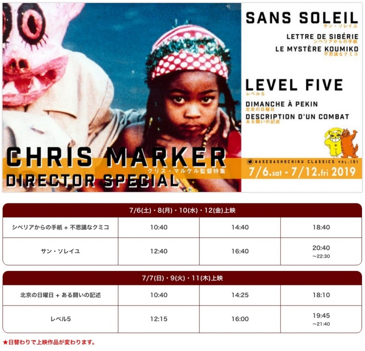 【早稲田松竹】7/6(土)~7/12(金) 上映『シベリアからの手紙』『不思議なクミコ』『サン・ソレイユ』『北京の日曜日』『ある闘いの記述』『レベル5』