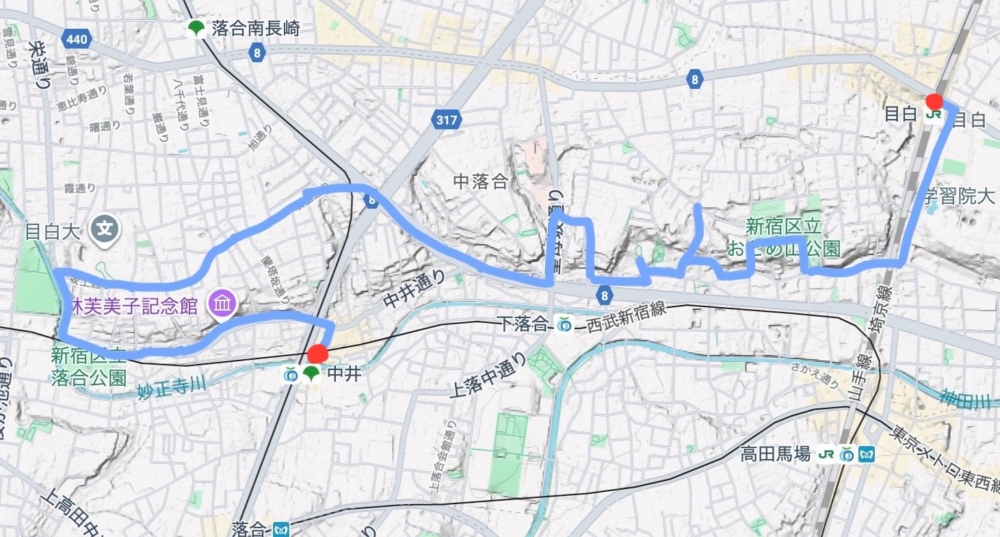 まずは落合エリアを歩きます。ルートは西武新宿線中井駅を出発し、目白大学を経由してから、東に向かってJR山手線目白駅を目指します。