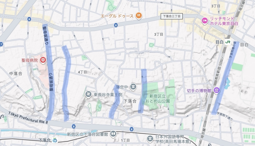 まず、山手通りを境にして西側のエリアを歩きます。地図を見ただけでも、坂道が多いことが分かりますが、それぞれ「一」から「八」までの数字が振られたものなど、きちんと名前がついています。