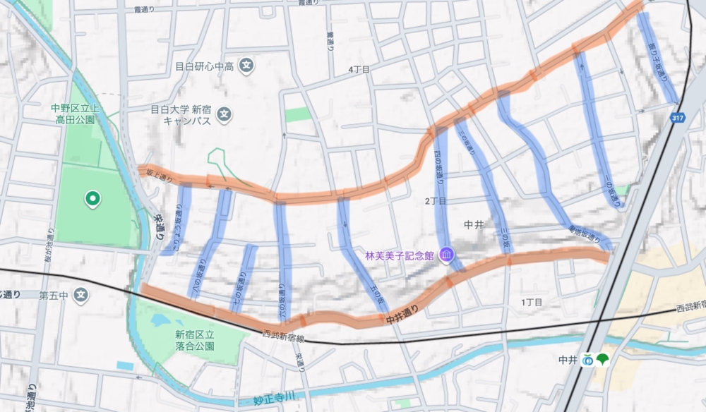 中井駅を出発し、坂下にぴったり沿うように続く中井通りを歩きます。この通りから坂道を見上げながら歩きます。