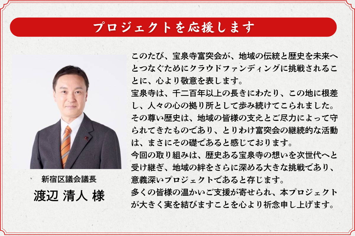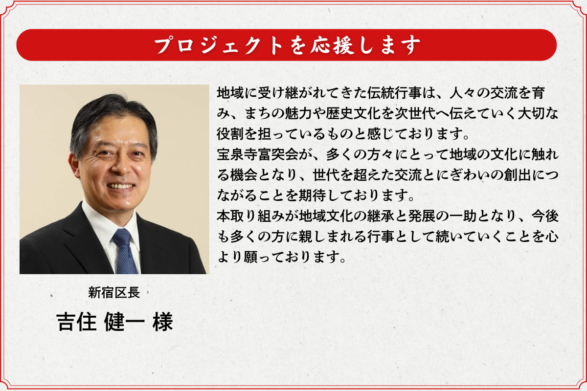 新宿区の吉住健一区長や新宿区議会の渡辺議長からも応援メッセージをいただいています。