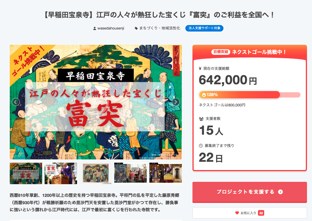 早稲田大学に隣接する合格祈願で有名な「早稲田 宝泉寺」が、 5月3日に開催する江戸時代の伝統行事「富突」を全国の皆さんに知っていただくことを目標に クラウドファンディングに挑戦しています。 4月15日までプロジェクトを実施しています。 【早稲田宝泉寺】江戸の人々が熱狂した宝くじ『富突』のご利益を全国へ!